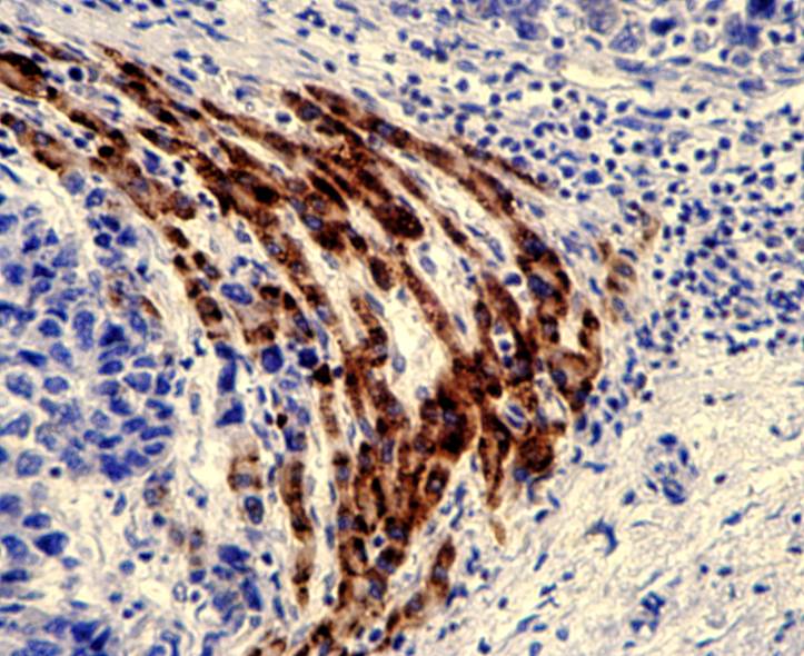 p504S是支链脂肪酸β氧化酶,表达于前列腺腺癌,但是良性前列腺组织阴性表达。在前列腺的癌前病变中也有表达,如高级别的前列腺上皮内瘤(PIN)和非典型腺样增生。除此之外,p504S在许多肿瘤中也可阳性表达如肝细胞癌、乳腺癌、胰腺胰岛肿瘤等。与34βE12、p63联合使用有助于前列腺癌的诊断。 |